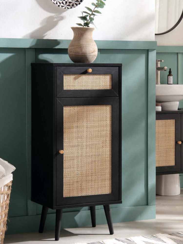 Frances Woven Rattan 1-Door Bathroom Cabinet, Black