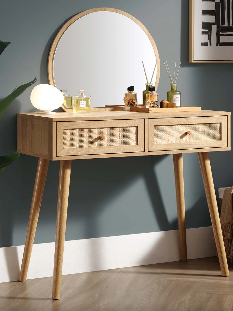 Frances Woven Rattan Dressing Table With Mirror, Natural Vanity