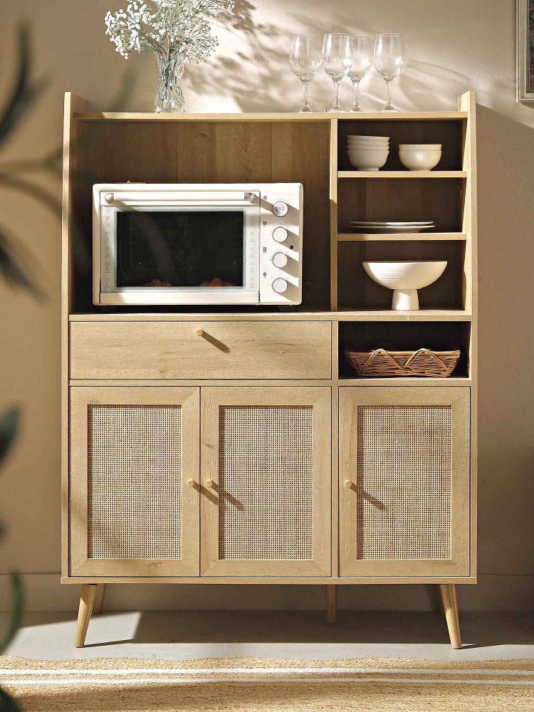 • With a range of multi-level shelves perfect for displaying glasses and small appliances, this highly functional Frances Kitchen Cabinet also comes with a drawer and closed cabinet space. The hand-woven natural rattan door fronts perfectly coordinate with the solid wood handles.