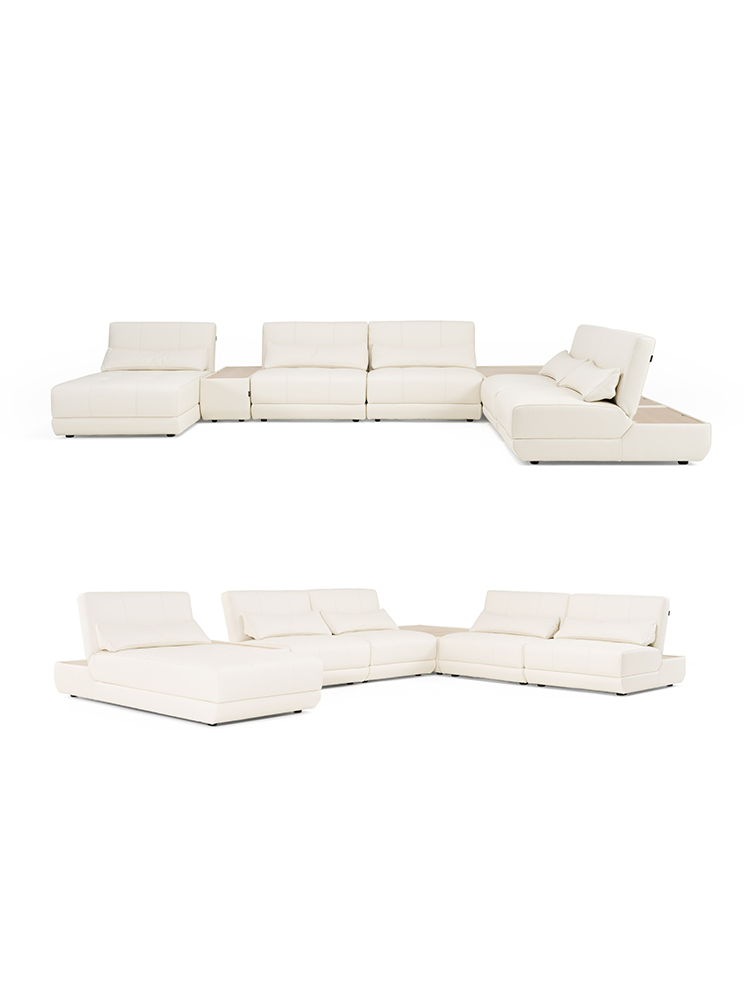 • The Garfield Sectional Sofa features a 7-piece modular layout upholstered in smooth off-white leather. Includes armless seating with built-in storage, a chaise, and two coordinating tables. Designed for indoor residential use. Ships fully assembled.
