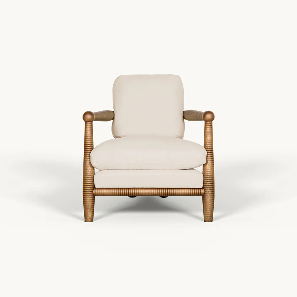 • The solid ash frame, the touchable texture of the wood carving, the playful round ornamentation, the corner-ready tapered shape—we could go on and on about Gio. And perhaps best of all, its cushions and frame are slipcovered for easy care and seasonal fabric swaps.