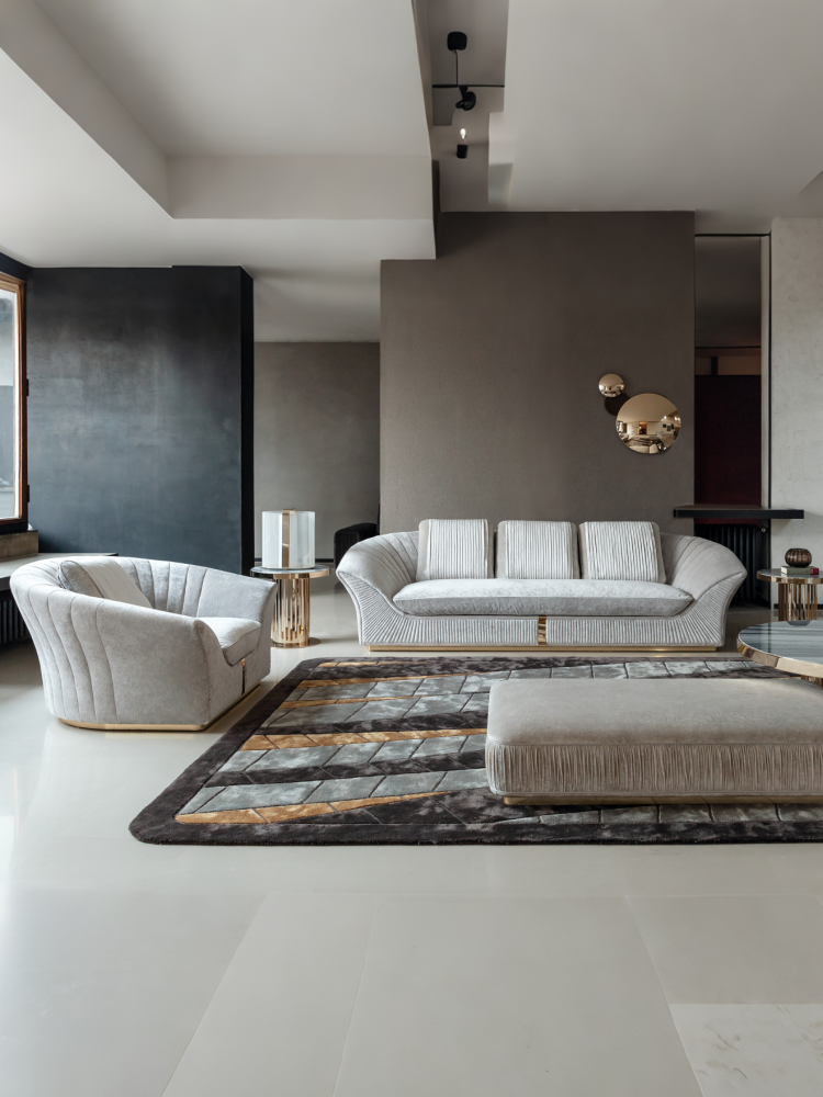 • Fixed sofa with quilted fronts available in 3 big back pillows and base + frontal insert in light gold chrome stainless steel with Giorgio Collection logo. Sofa seats and sides with special stitching in polyurethane foam wrapped in down feather. Sofa armrests realized in quilted finish.