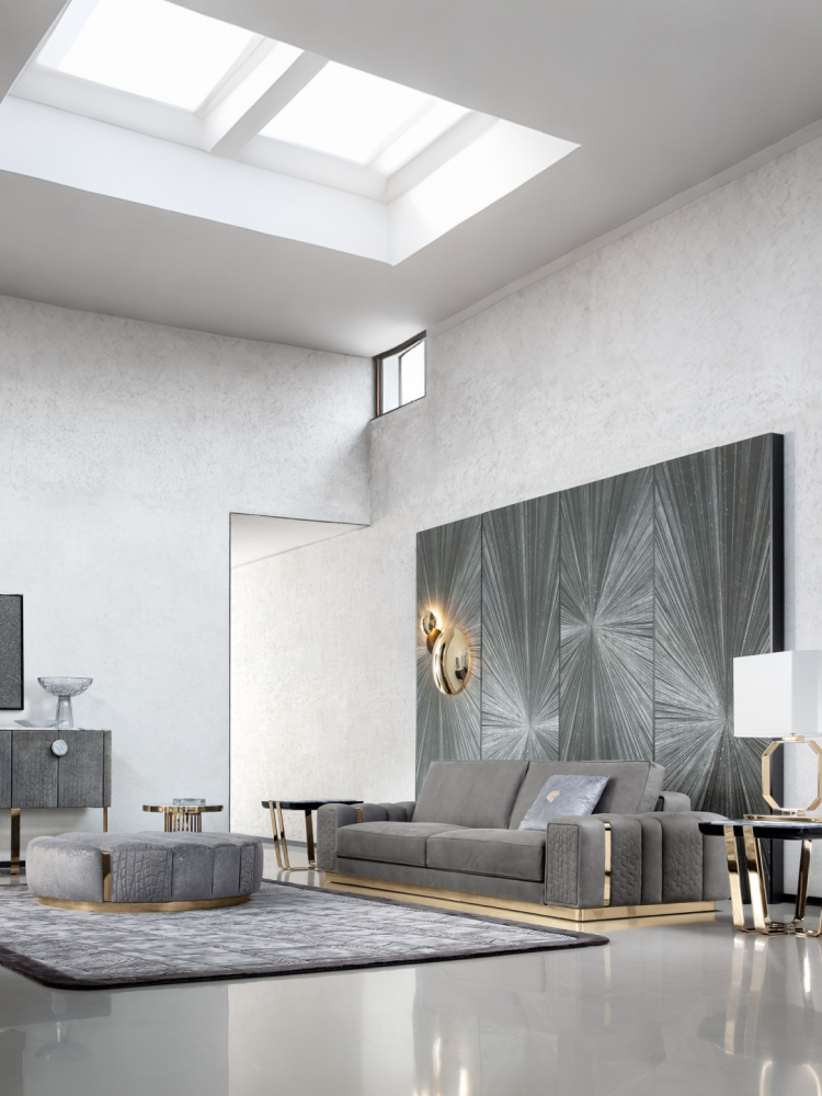 • Sofa seats and sides with special stitching in polyurethane foam wrapped indown feather. Sofa armrests realized in quilted finish. Base and metal trims onthe armrests in light gold chrome stainless steel.