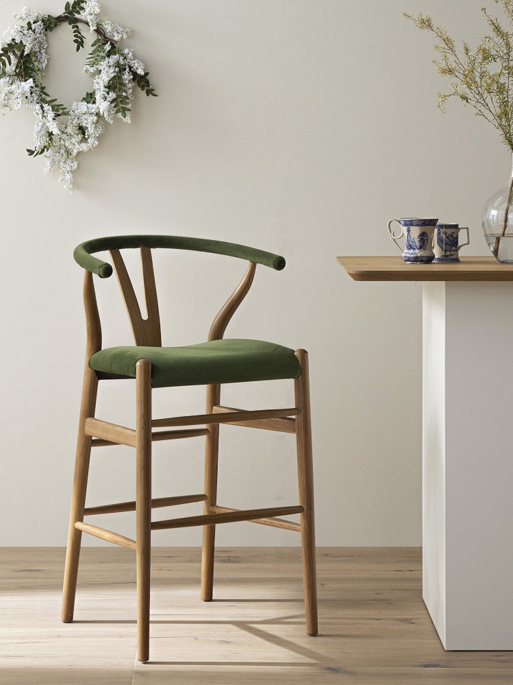 Hansel Upholstered Counter Stool, Moss Green Velvet And Light Walnut Frame
