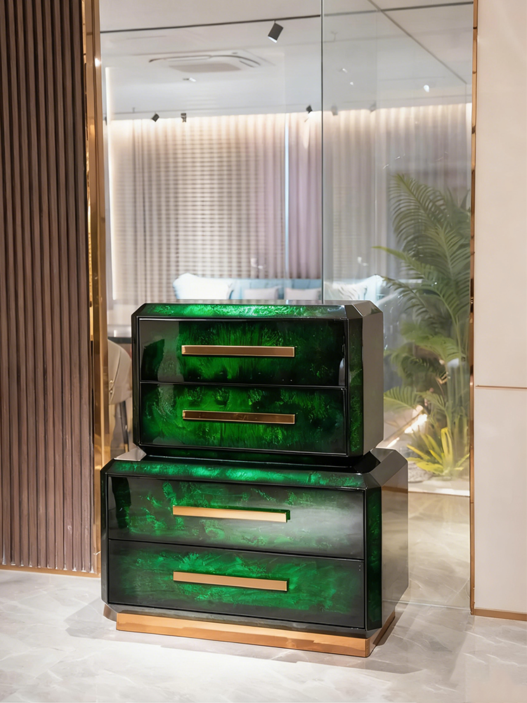 • A multifunctional display cabinet with the appearance of jade, consisting of an upper and a lower cabinet. The cabinet's design is as beautiful and sparkling as a cut gemstone.