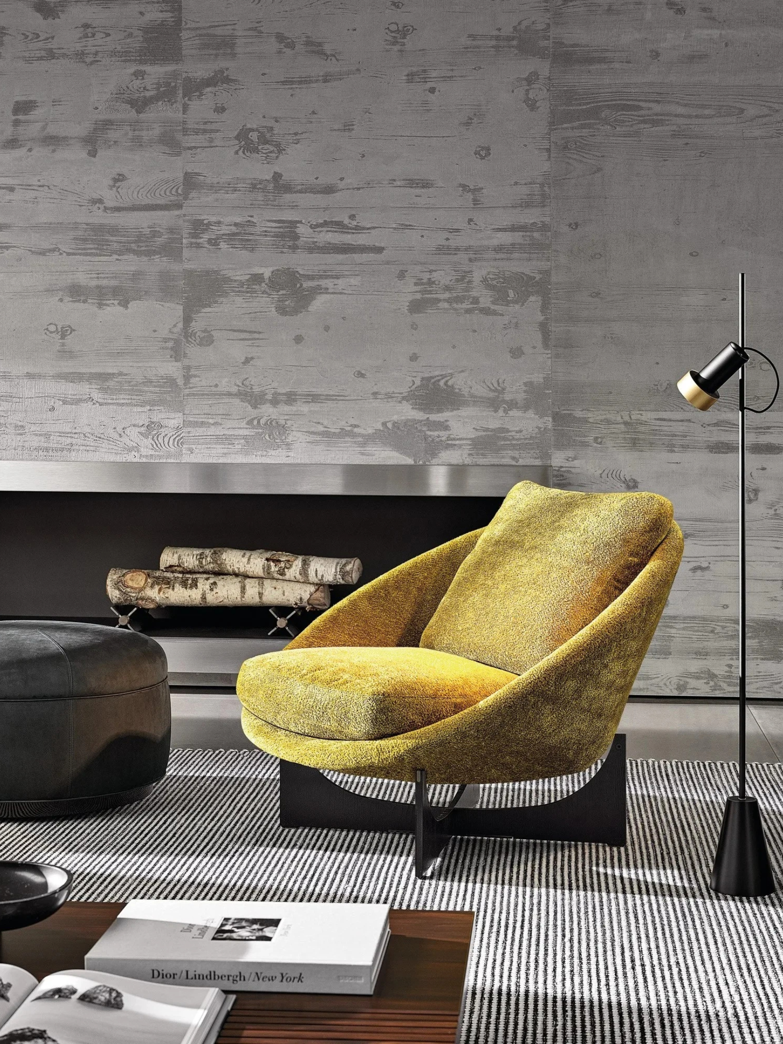 The design, inspired by the 1950s, recalls the typical stylistic marks of Brutalist architectures, here softened by the masterful use of textured fabrics and comfortable, ergonomic cushions.