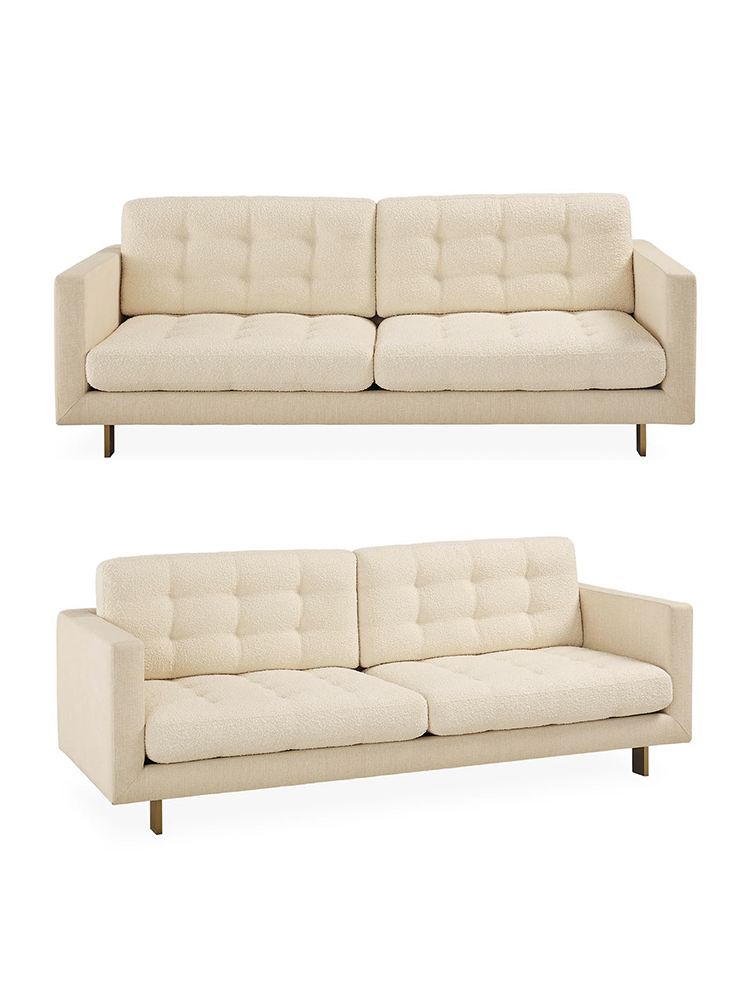 • Featuring a linen upholstered frame and family-friendly bouclé cushions, our Ford Sofa features reversible button tufted cushions and is perched on smart, brushed brass legs. The strong silent type with an inner glow, this modernist masterpiece finally answers the age-old question: If Cary Grant were a sofa, what would he look like?