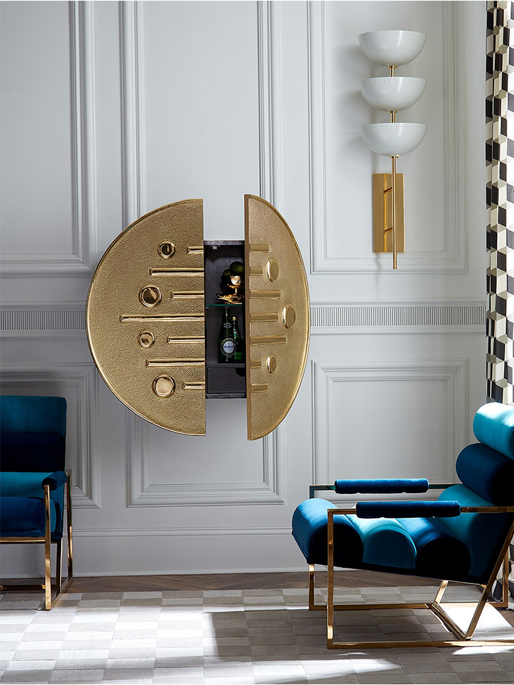 • An ebonized and limed oak cabinet with doors featuring a relief texture originally sculpted in our Soho pottery studio—clad in a sheet of brass, then hand-hammered and polished to perfection. Designed to mount to the wall or stand on polished brass legs, our Reform Circle Bar is a must-have for couture cocktail hours. Interior features include adjustable shelves, a soft-close drawer and three organizational compartments.