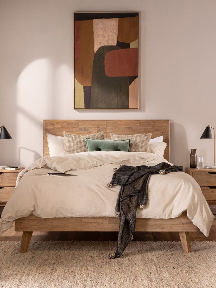 • Design & Style: The Kabbann bed frame has a mid-century modern design with contemporary-rustic elements. It features typical modern slanted legs and an impressive headboard that highlights the natural variations and grey-brown tones of the hardwood.
