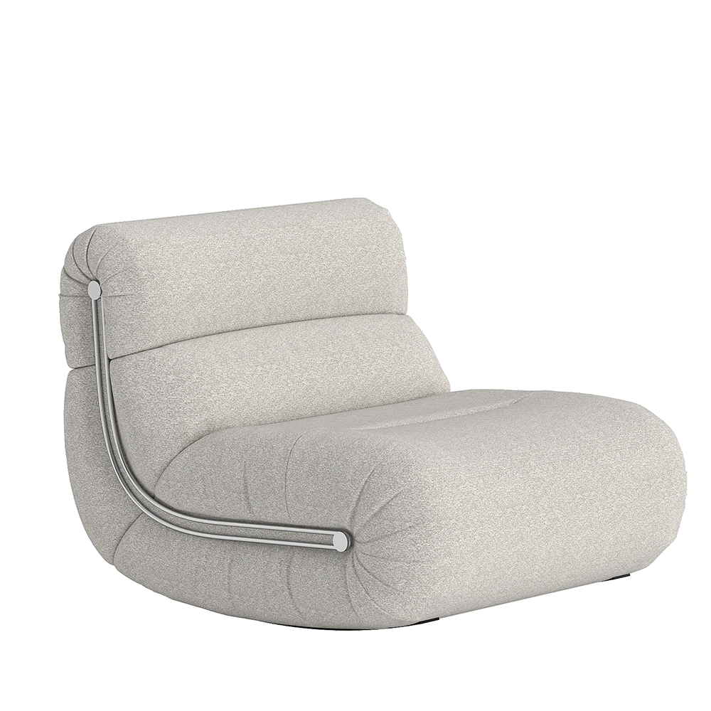 • The Kalimba Lounge Chair is composed of three distinct parts and features a visible stainless steel bar. The contrast between the cold metal and warm upholstery exudes contemporary charm in any living space. Its inward curling design invites you to sit down and embrace modern, sophisticated style. With sleek stainless steel detailing and an inviting curved design, the Kalimba Lounge Chair stands out in any room. Additionally, the chair can rock with a gentle tap, adding a playful musical element to your space.