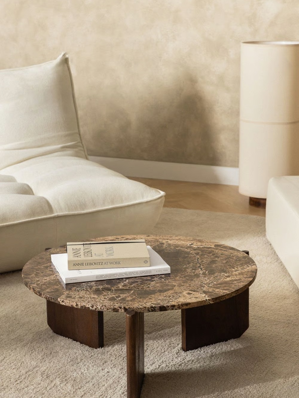 If you're looking for a centerpiece for your living room that will steal the show in any setting, the **round coffee table Lavinia made of natural stone and mango wood** is the perfect choice. This elegant coffee table is a tribute to timeless charm and classic refinement. The vintage aesthetic that inspired its design is conveyed through its **round tabletop made of exquisite natural stone with a lacquered finish**, reminiscent of the essence of grand historical living rooms, where every detail tells a story of style and sophistication. The **semi-glossy finish** of the surface subtly highlights its texture, achieving a perfect balance between refinement and simplicity.