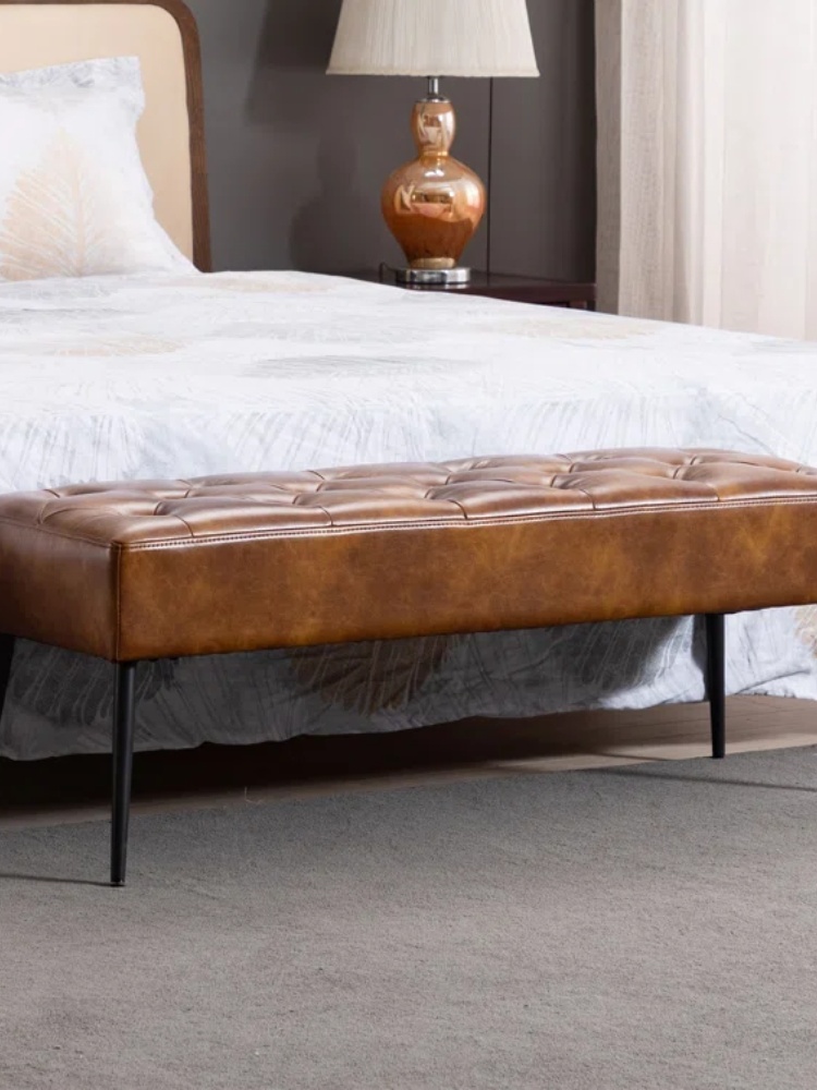 Lora Mid-Century Modern Tufted Leather Bench, 44" Wide With Metal Legs