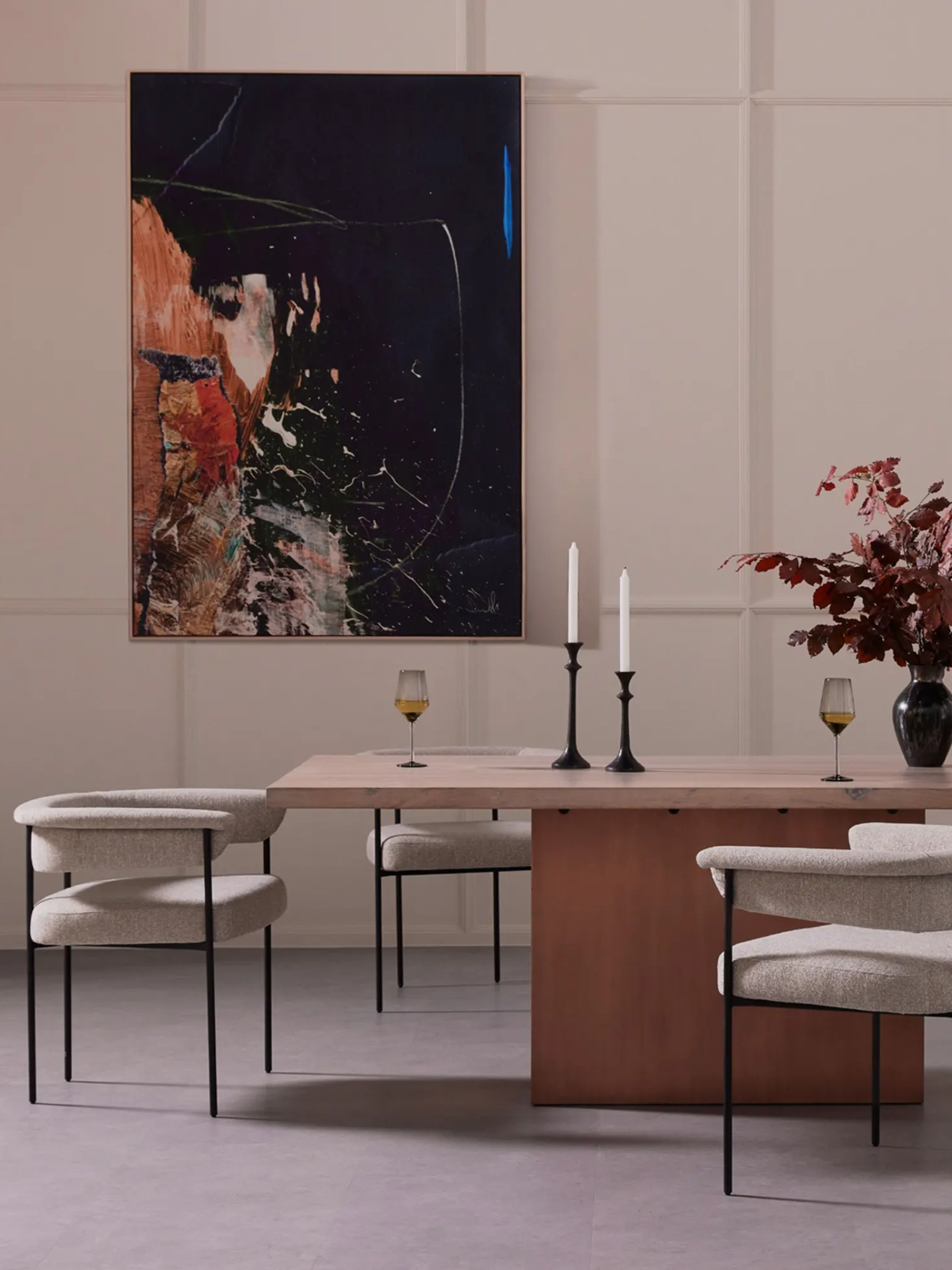 Airy and light with slim, black-finished iron framing, camel-colored upholstery lends texture to a beautifully sculpted dining style featuring a yoke back and exterior fold detailing.