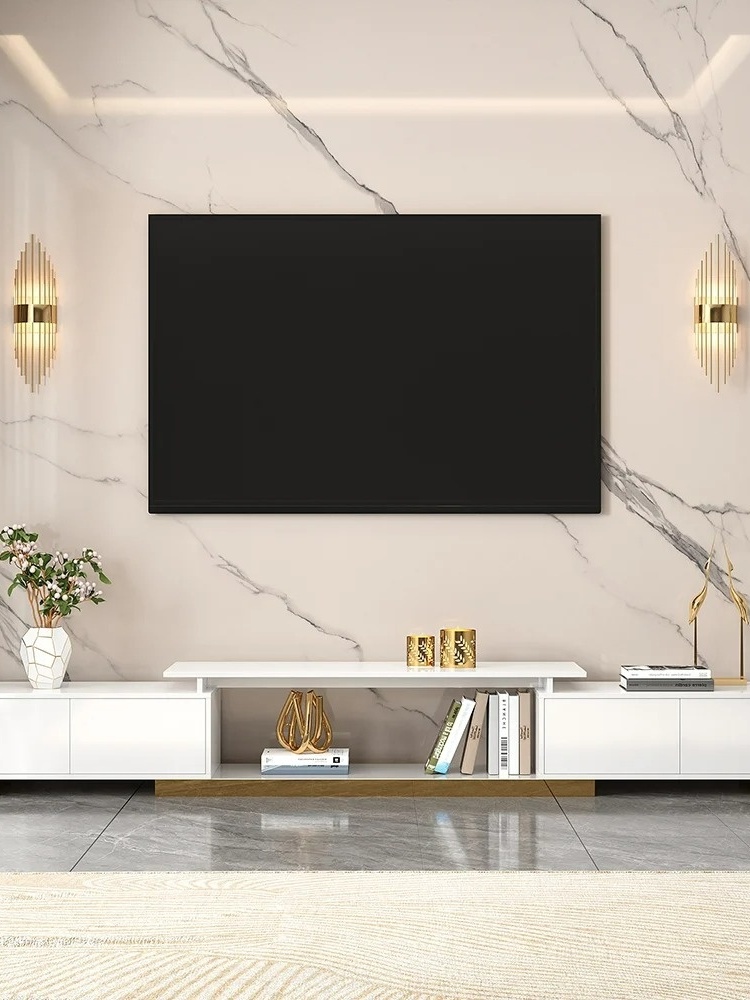 This is a shiny, extendable TV lowboard with adjustable length and spacious storage space. The extendable design fits all room sizes and offers a functional and elegant solution. It keeps media devices and all their accessories in order and is good for a modern home.