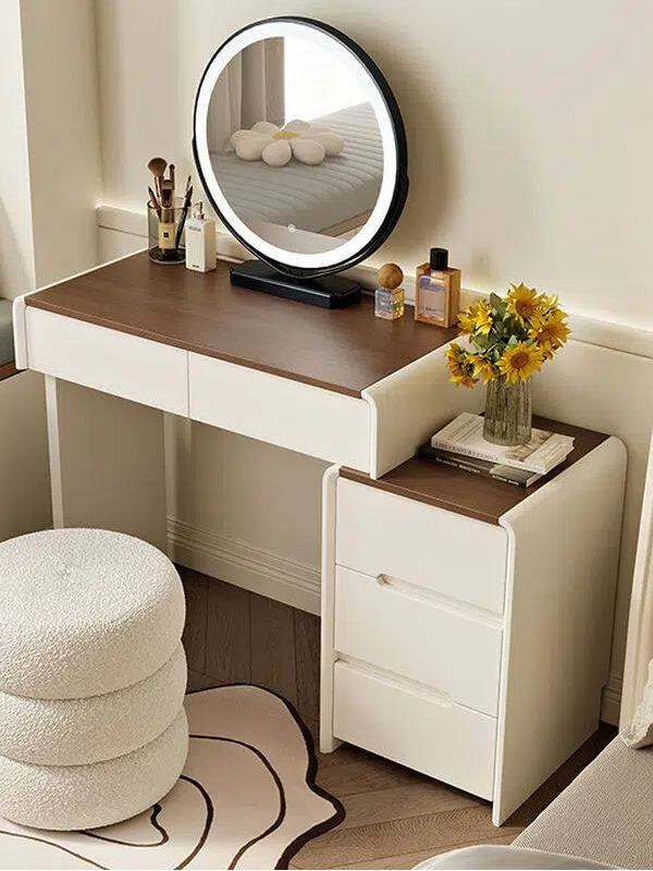 • Vanity Drawers: Two spacious drawers (with optional dividers, as showcased) keep cosmetics, skincare, and small accessories neatly organized—ideal for lipsticks, palettes, or jewelry.