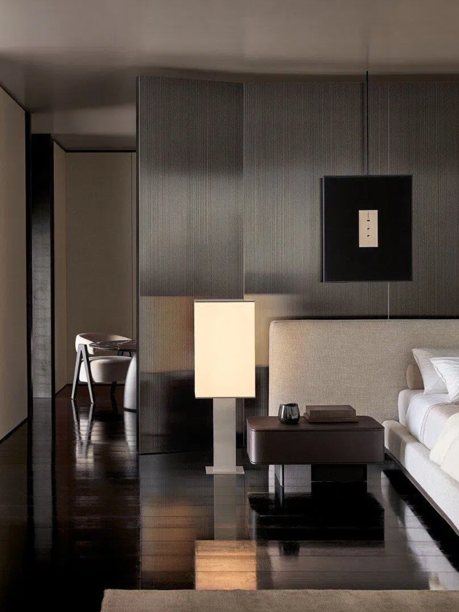 The Brera bedside table echoes the horizontal lines and architectural inspiration of the eponymous bed. Available in two sizes, it fits within the wider headboard and features a drawer, finished with delicate finishes such as marble.