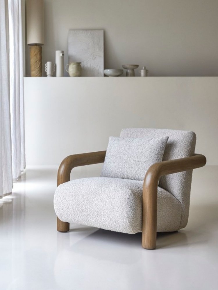 • The Nina armchair, made of solid mindi wood and bouclé fabric, will add a cozy touch to your living room. Its versatile design will make you want to spend relaxing hours with a good book.