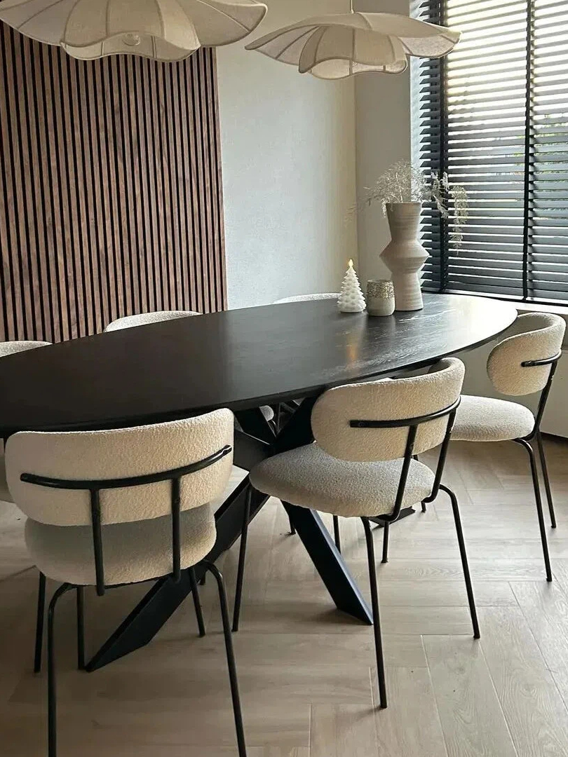 This off-white dining chair, upholstered in soft Teddy Bear fabric, offers luxurious comfort and is the perfect complement to any dining table. The black metal legs further enhance the chair's luxurious appeal, making it a perfect addition to any living or dining room. The soft Teddy Bear fabric provides a cushioned seat for a comfortable sitting experience. With a seat height of 47.5 cm and a depth of 44 cm, it's the perfect height for dining tables, whether relaxing during the day or enjoying a drink in the evening. Seat height is measured from the floor. A clearance of approximately 20 cm between the chair and the tabletop ensures optimal comfort.