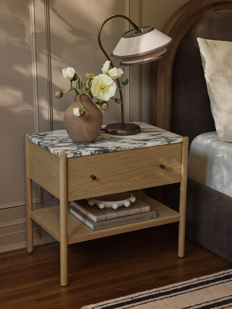 • Our Philana nightstand brings a touch of polish to any bedroom edit. A honey finish highlights the natural grain warmth of the frame, grounding the luxe marble top with organic appeal. A convenient drawer and lower shelf complete this balanced design, fashioning a modern nightstand with timeless appeal at your bedside.