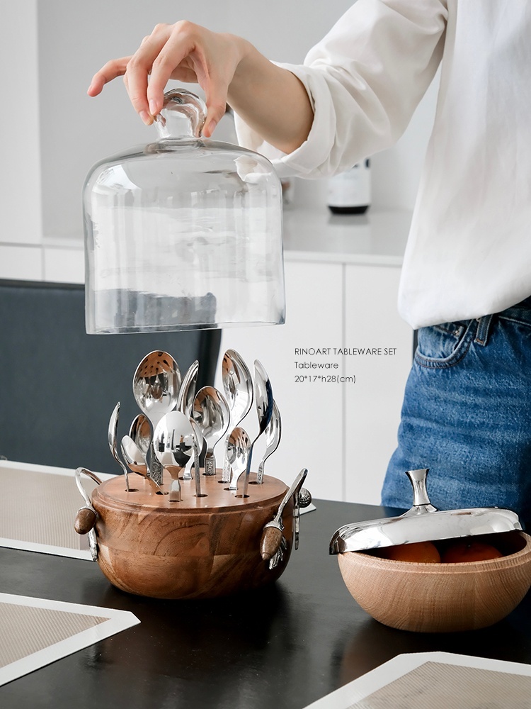 Pine Cone Hand-Carved Mango Wood Tableware Set With Dust-Proof Glass Dome Includes Three Spoons