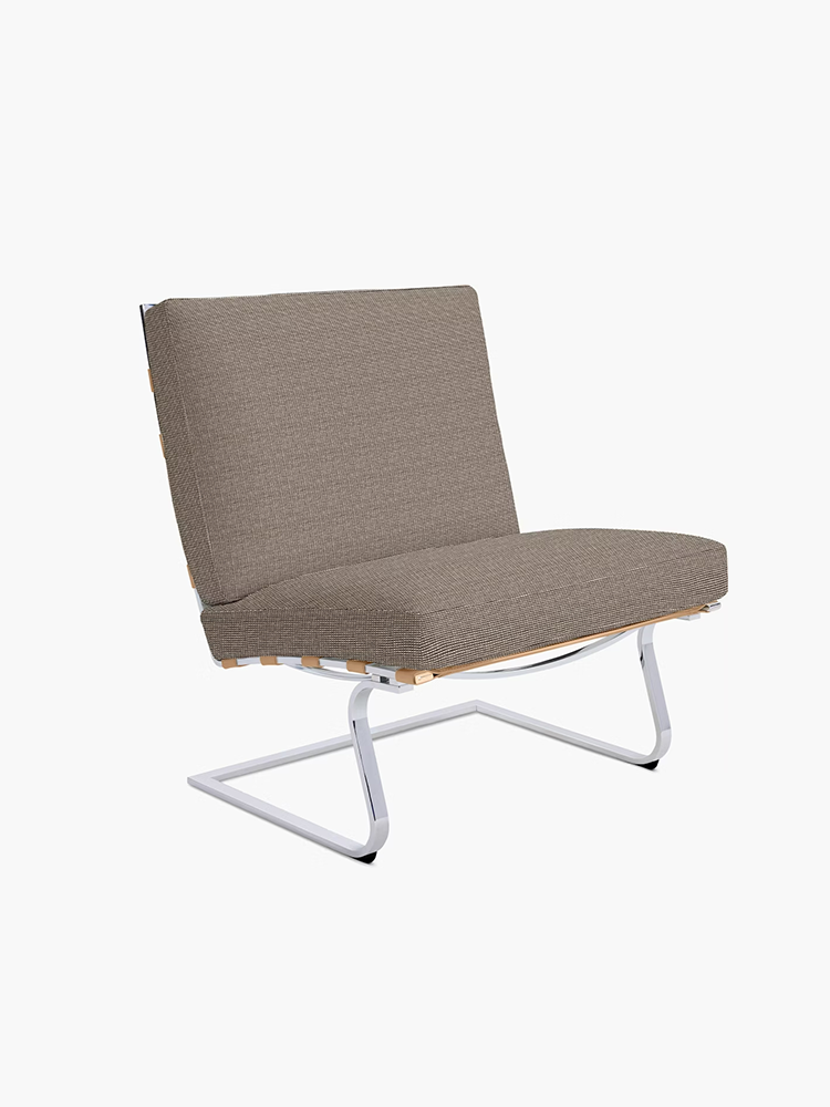 • The sophisticated lounge chair delivers comfort and versatility with a cantilevered base, leather strap back, and sleek form. A pair of untufted cushions and optional armrests top the chair’s pleasingly kinetic frame. It is offered in two finishes and a wide array of upholstery options.