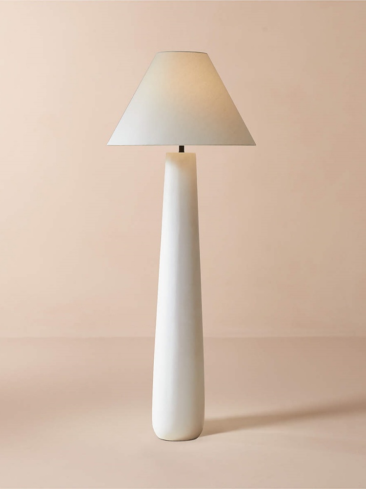 • Monochromatic floor lamp stands on a solid ivory concrete base that tapers to an ivory linen shade.
