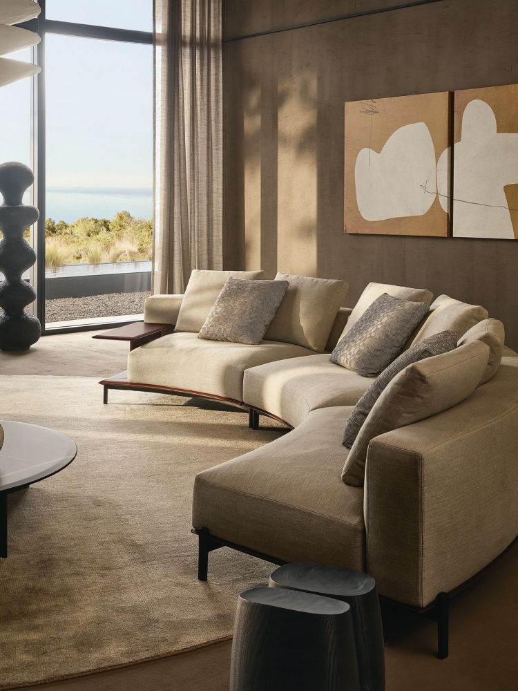 • Designer Jean-Marie Massaud created a home landscape with a strong architectural essence, where the Brera Sofa takes center stage, expressing elegance through its horizontal, clean, and modern design language. From classic straight-line versions to curved options, it offers a variety of layout possibilities for larger spaces and lounging areas. By incorporating cushions, it brings relaxation craftsmanship into the living space, providing exceptional comfort. The leather stitching details and newly selected premium fabrics emphasize expert craftsmanship, highlighting the exquisite details of the seams.