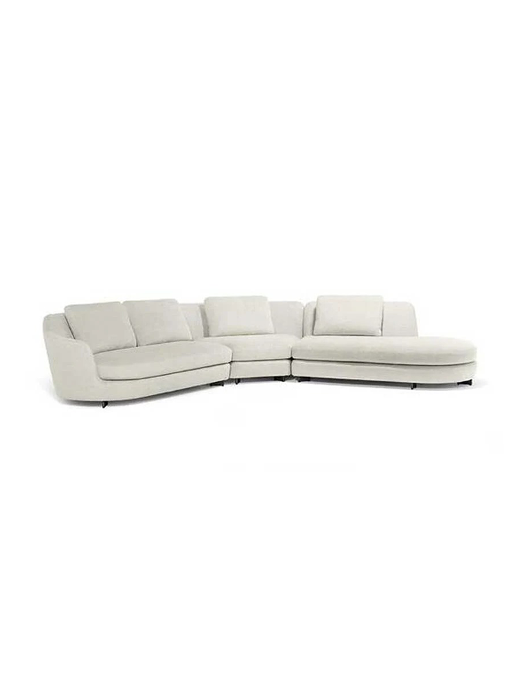 • The curved DUO sofa is available in multiple versions: two-seater, three-seater and modular, with 60° corner components. This modern Italian sofa can be combined with a matching Chaise Longue that can be positioned as an end piece on either side. The upholstery can be entirely in Pelle Frau® leather or fabric, or in a leather/fabric combination. The stitching is tone-on-tone. The fabric upholstery is removable for both the frame and the cushions, while the leather upholstery is removable only for the seat and back cushions. The cylindrical feet are made of black anodized aluminum with plastic spacers or, upon request, in a bladed version. The internal structure is made of birch plywood and the padding is in polyurethane. The spring system is obtained with elastic straps.
