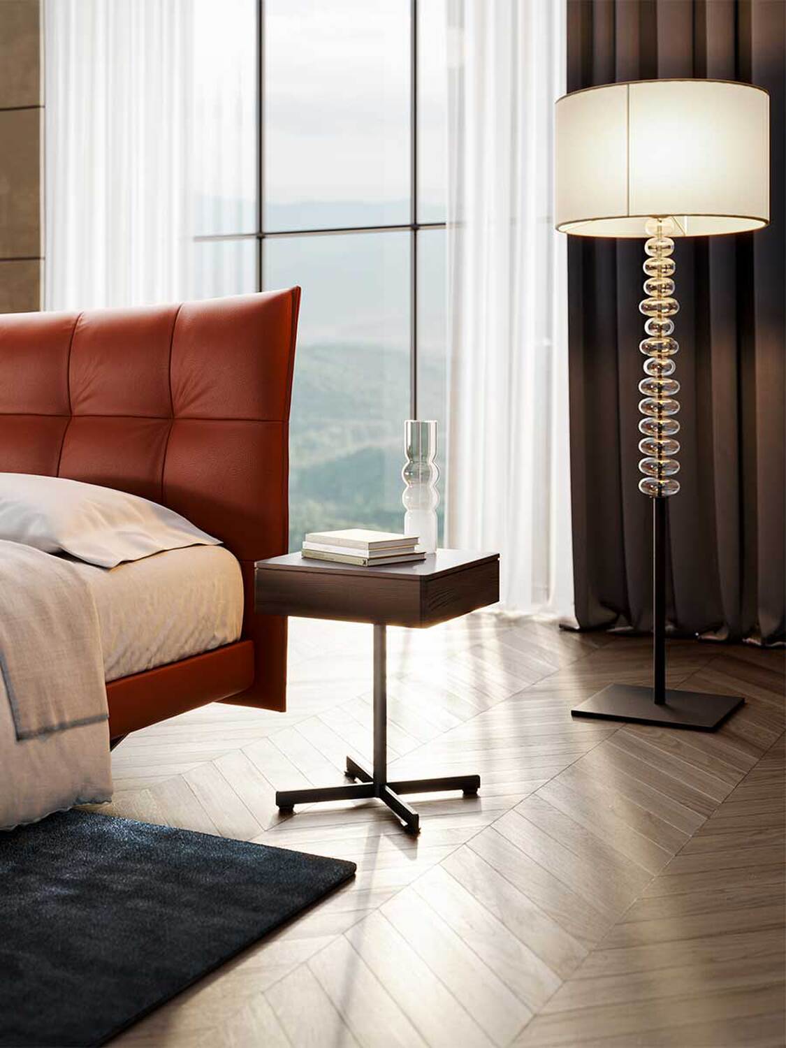 Fede floor lamp has a painted metal frame on which is applied a precious necklace of transparent glass bubbles. The round lampshade is available in 3 colours.