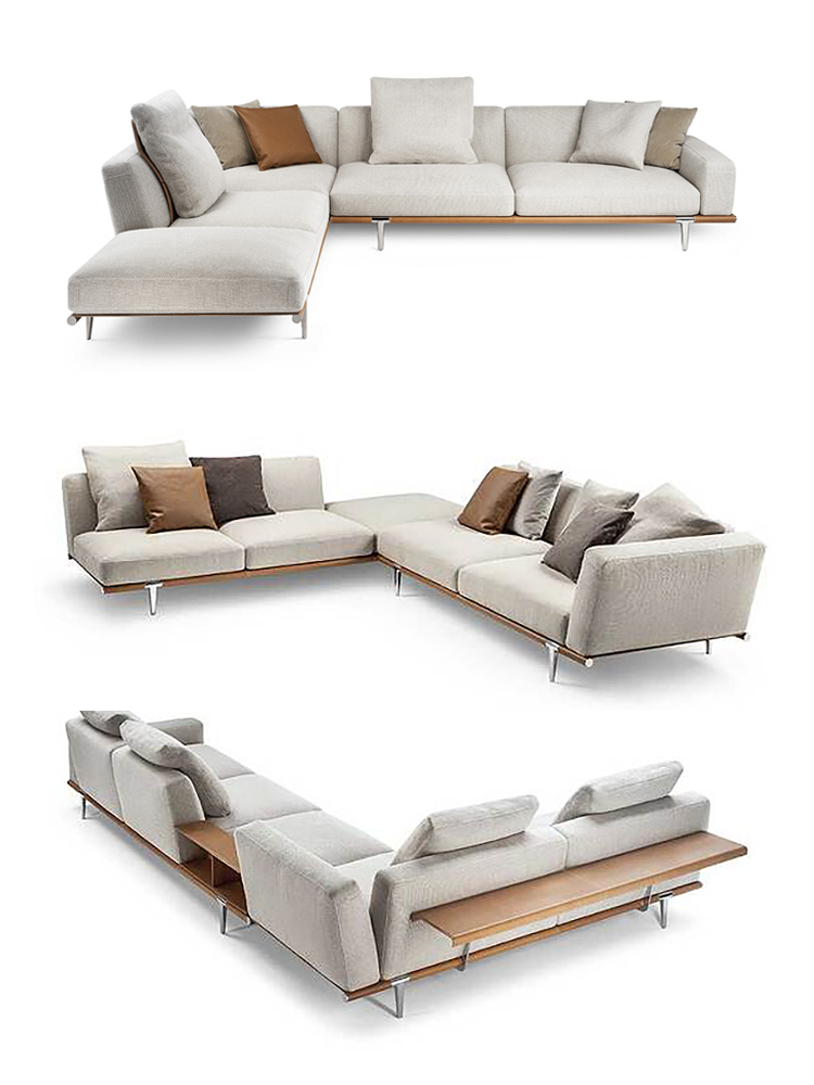 • Let it Be is a modular furniture system, open to infinite configurations. The modular sofas can be completed with shelves and storage units that expand their functions. The structure and the soft down cushions appear to be suspended on saddle-leather straps. The foot, unexpectedly set back compared with the corner, exalts the sensation that the seats are floating in space. The purity of the design melds with the precious details. The visible leather and saddle-leather stitching bring to mind the luxurious workmanship of saddles and harnesses.