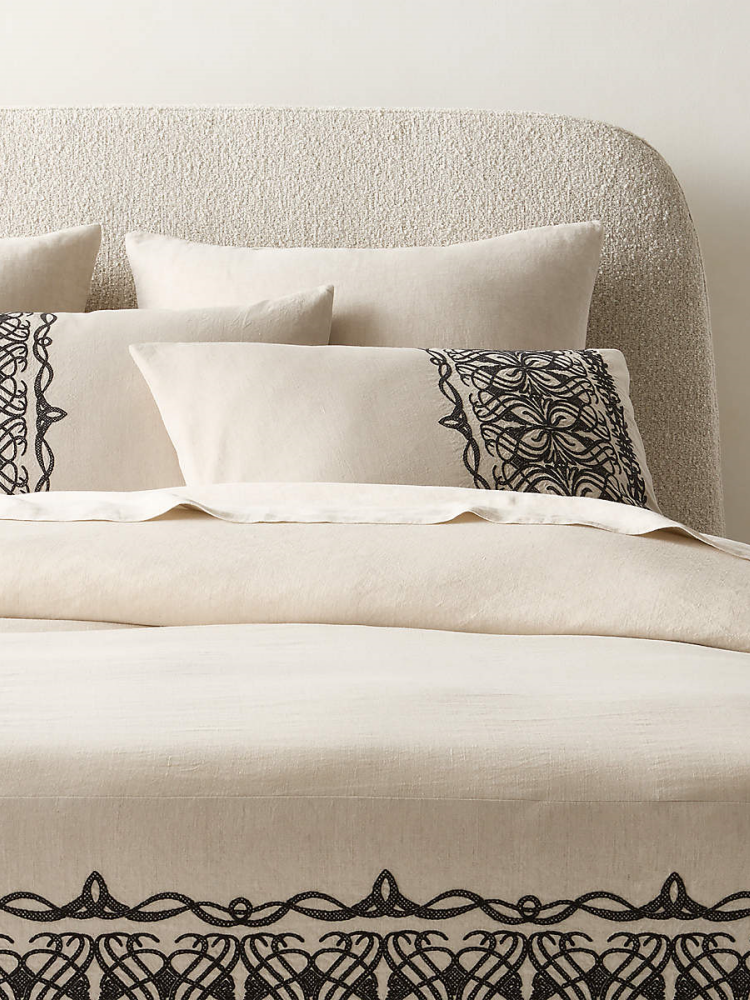 Designed by Brett Beldock, duvet cover features a stunning embroidery pattern inspired by the graceful lines and organic motifs of Art Nouveau. Contrasting black embroidery adds a modern touch to the soft blend of natural linen and organic cotton. Duvet reverses to a crisp 200-threadcount percale for a smooth contrast.