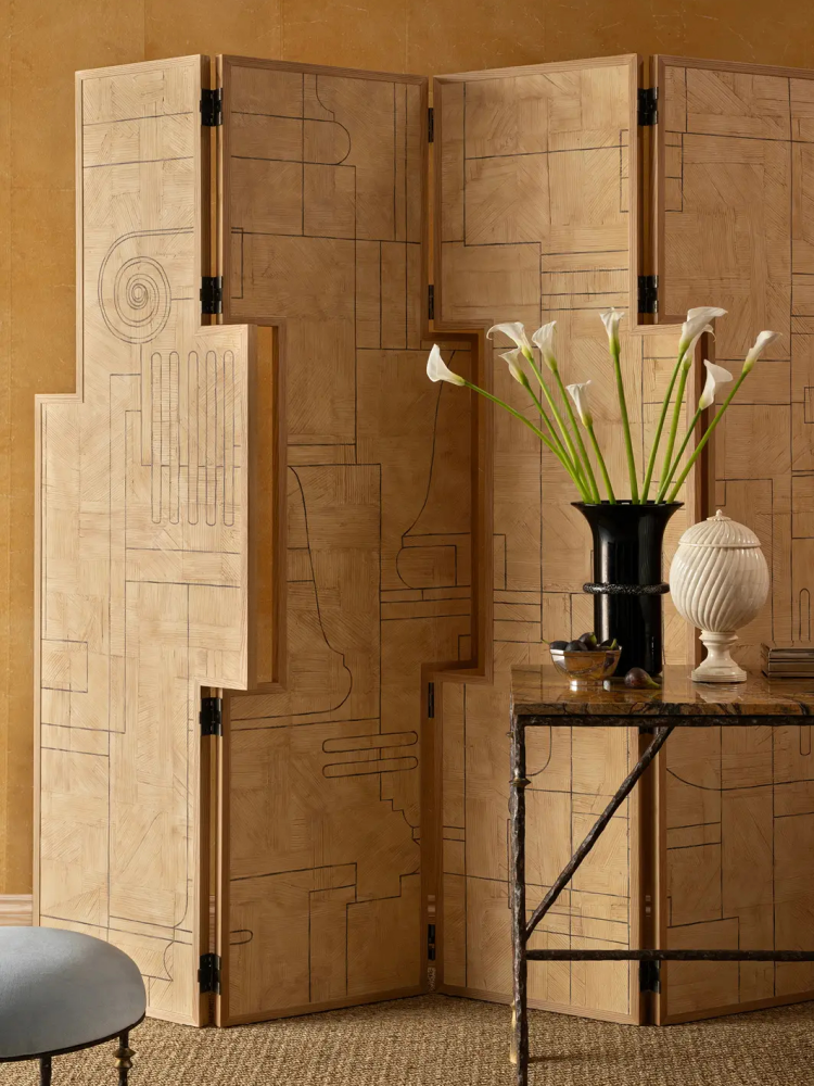 • Inspired by the intricate craftsmanship of Art Deco and the luxurious materials that typified its popular aesthetic, ‘Tortue Boiserie’ is a vivid depiction of stunning tortoiseshell in a high-gloss lacquered finish accented with aged gold details suggestive of architectural drawings – enlarged and amplified as though inlaid into the walls.