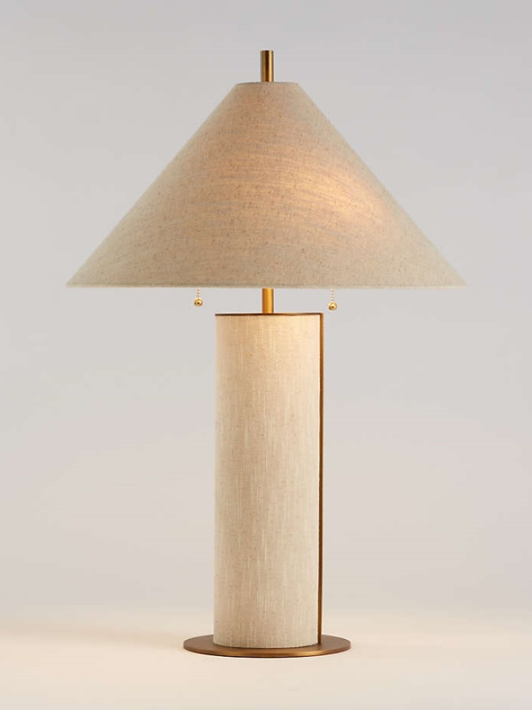 • Remi wraps a table lamp entirely in ivory linen with gilded accents. Topped with a steeply pitched matching shade, the columnar base shows off the slubbed fabric and the warm burnished brass accents. Adding texture and softness next to a sofa or armchair, our Remi linen table lamp is a Crate and Barrel exclusive.