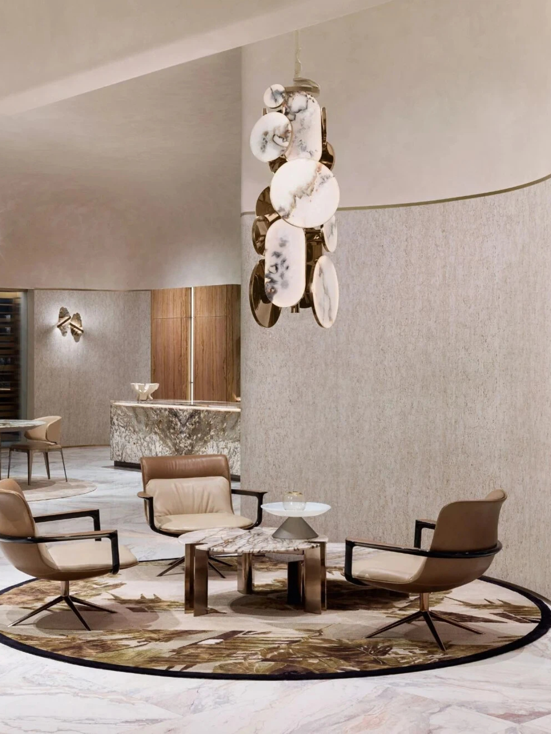 This chandelier features a chrome-plated metal frame and tapered steel diffusers made of ultra-thin stone slabs with backlit onyx. Tubular lamp arms connect each lamp head to a central lamp post, powered by low-voltage drivers integrated into the ceiling panel. All metal components are available with finishes selected from the catalog.