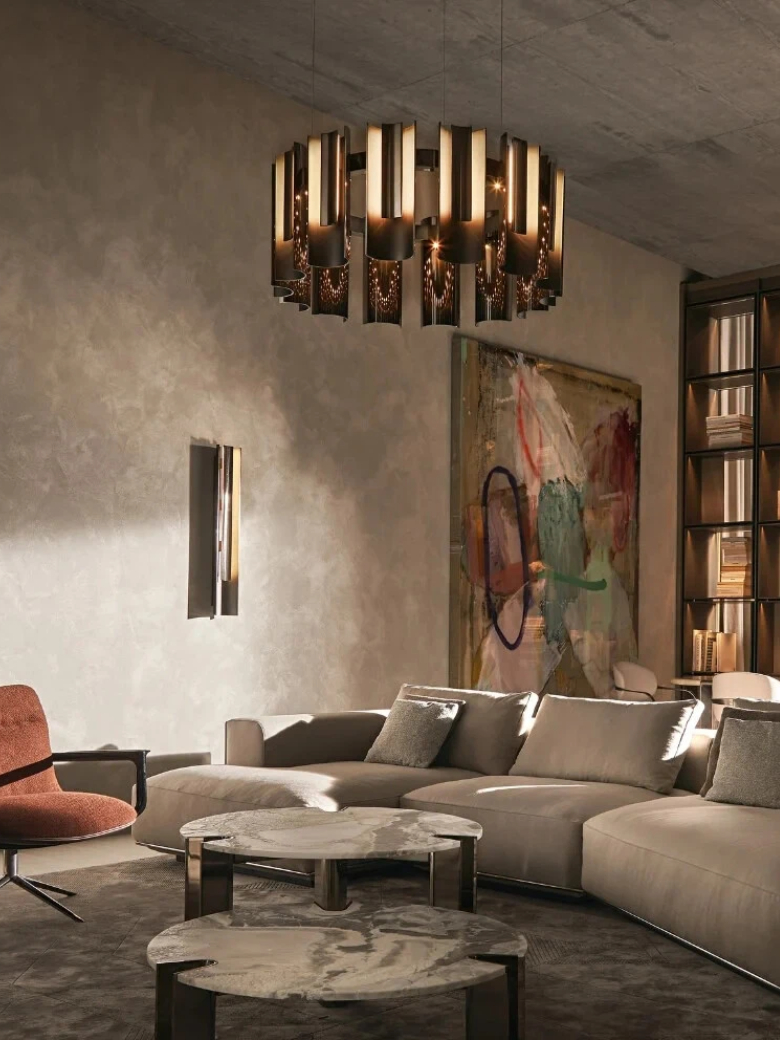 Composed of curved aluminum modules—polished on the outside and finely satin-brushed on the inside—anchored to a central support ring with integrated LED diffusers. Suspended by adjustable steel cables, the system combines visual lightness with sculptural presence. Offered in a curated selection of metal finishes.