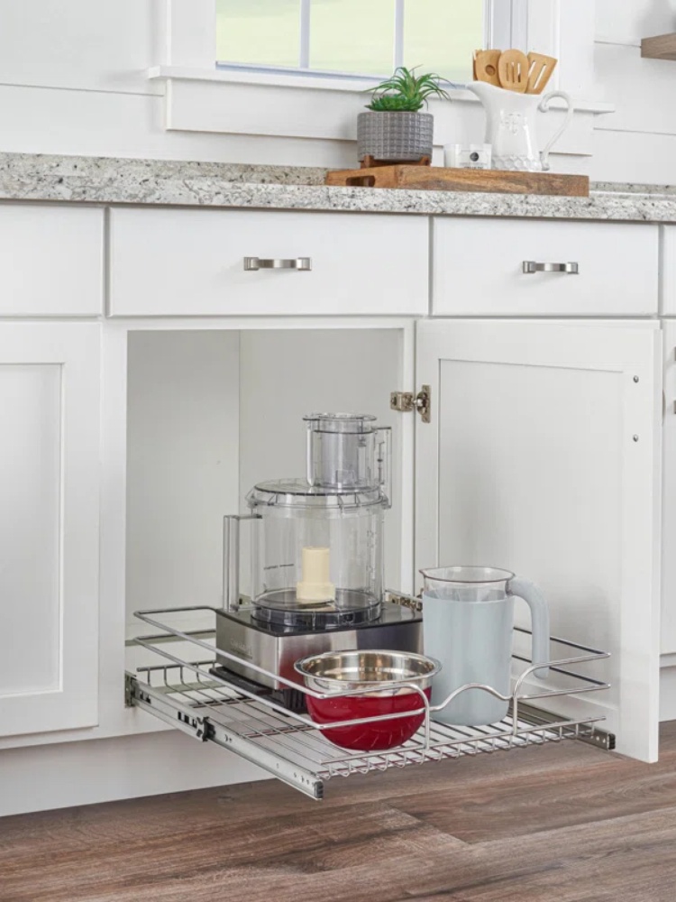 • Single-Tier Bottom Mount Pullout Steel Wire Organizer to access pots, pans, lids, bottles, stand mixers, and other kitchen accessories