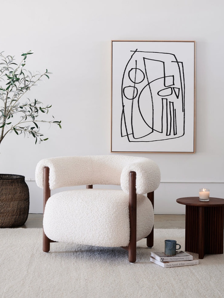 The Rio Lounge Chair harmoniously blends contrasts: softness and structure, voluminous and voided space, textured and sleek surfaces. The Rio adds warmth, gentle shape, and texture to any space with its plush upholstery, solid wood frame, and curved composition. It has a significant presence and personality without being bulky, making it our most versatile accent chair.