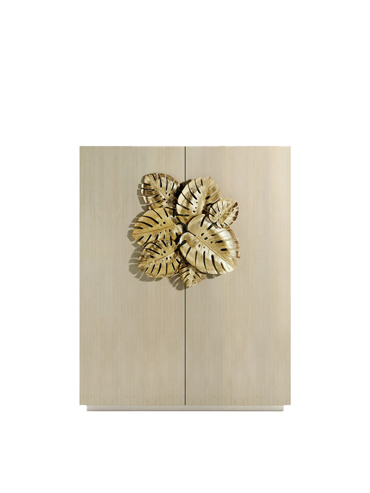 Jewel handles in cast brass available in platinum or Gold finishing. Optional Snake or Monstera Leaves jewel handles in cast brass in Gold finishing.