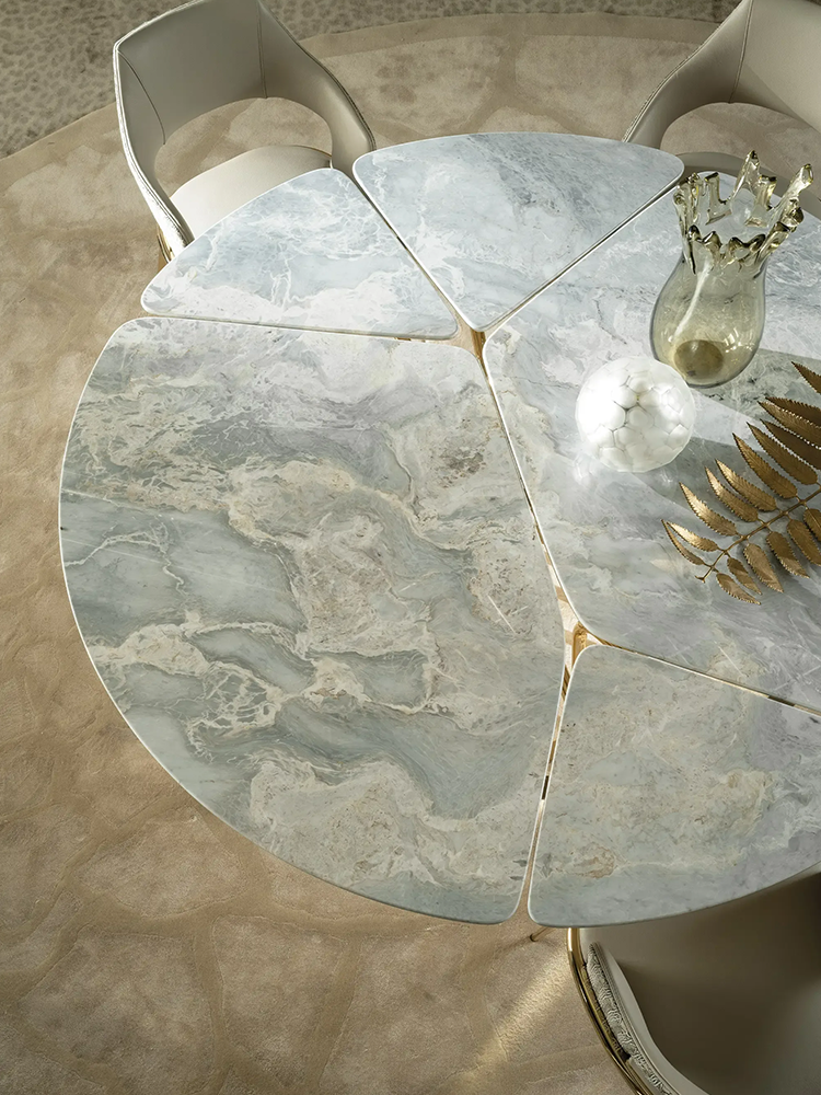 • Fascinating and evocative, Baobab table takes us to the heart of the savannah with its original shape that refers to the namesake African tree. The top, composed of five irregularly shaped marble elements, reminds the foliage of the baobab, while the base made up of calendered cylindrical iron tubes recalls the trunk. A sculptural table full of meanings for a scenographic dining room.