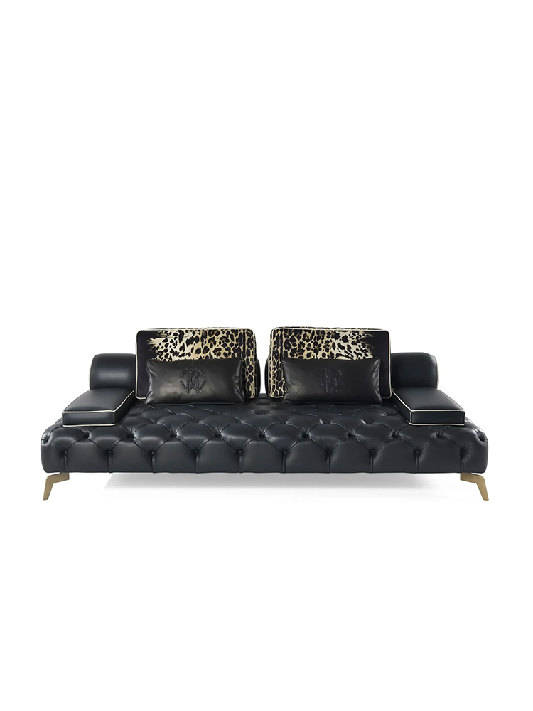 • Darlington is an iconic sofa of the Roberto Cavalli Home Interiors collection, characterized by a refined capitonné finishing. The sofa is available in different versions, all perfectly representing the brand’s sensual and bold character and is completed by cushions with wild animal patterns.