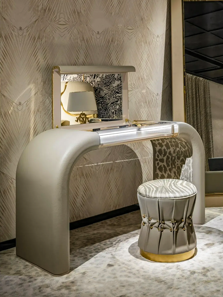• Soft and sensual lines and sophisticated charm for the Iman dressing table. A luxurious, elegant yet functional piece of furniture characterized by a curved structure upholstered in leather and an interior compartment with integrated LED lighting and mirror.