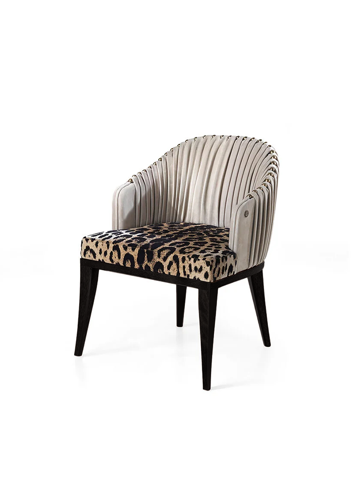 • Like the other elements in the line – sofa, armchair and pouf – the Sharpei chair is distinguished by its precious and refined tailoring, enhanced by the decorative metal sphere in the finishes of the collection.