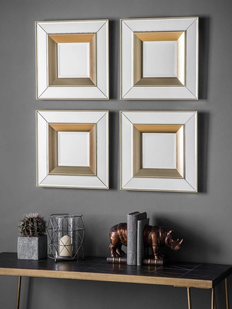• Introducing the Erney Mirror Square - a set of 4 sectional mirrors that will transform any plain wall into a quirky statement. With its playful gold and mirror frame, this set adds a touch of fun to any room. And the best part? It's available for fast delivery, so you can have your new statement piece in no time.