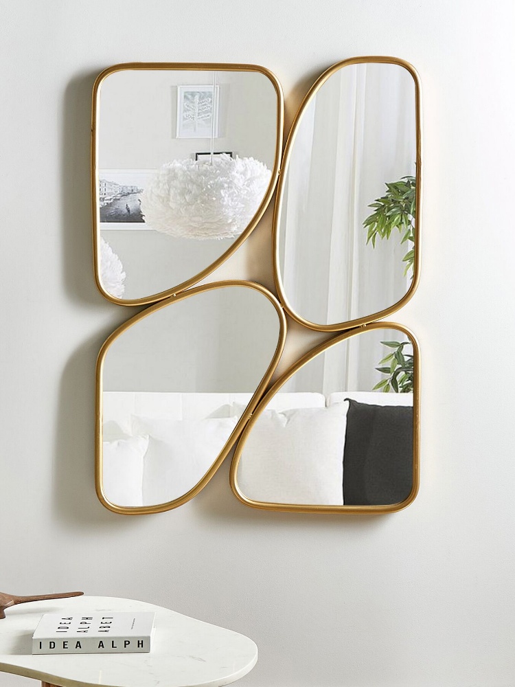 • Four individual panes of modern mirror each framed with a cock bead molding in Aztec Gold, fused together to form a single mirror. This mirror can hand in portrait or landscape orientation.