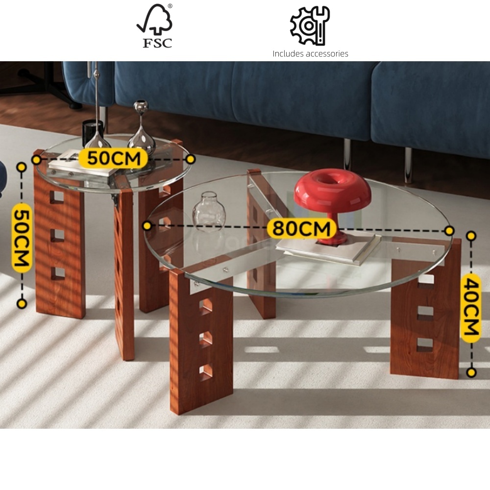 (Set Of 2) 80Cm Solid Wood Coffee Table Medieval Round Tea Table Tempered Glass