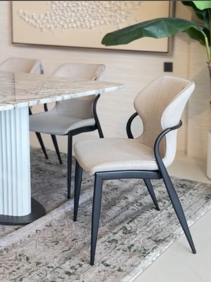 This dining chair is an elegant and sophisticated addition to any dining room. Upholstered in a soft, neutral fabric, it features a high backrest and plush cushioning for maximum comfort. The metal frame is sturdy and durable, ensuring longevity. It is the perfect size for most dining tables.