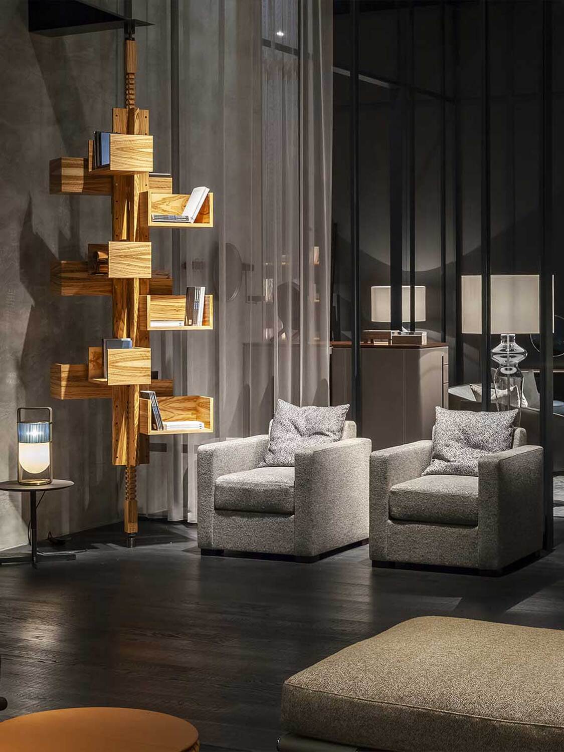 The structure is distinctive both for its intricate cabinet work and its sculpted appearance, which ensures that it is the centrepiece of the room. The supporting structure of the Albero bookcase is in solid Canaletto walnut. It consists of two notched columns, with a special rack joint, and four vertical posts with regular perforations allowing for the mounting of twelve shelves. The latter are in MDF with wood veneer. The caps, at the ceiling and on the floor, are attached to the ends of the toothed supports. The top cap is inserted in a “cup” anchored to the ceiling. The bottom cap grips the floor with a non-slip rubber. The bookcase is held securely in position by four metal locknuts in the caps. The fixing elements (caps and cup) have an antiqued burnished steel finish. The signature of the designer and the Poltrona Frau logo are laser engraved on the lower toothed support. The Albero bookcase can rotate 360°. Upon request and for an additional fee, the shelf surfaces can be embellished and protected with a 4 mm-thick Cuoio Saddle leather insert with tone-on-tone dyed edge. The insert has hand markings around the edge and is branded with the Poltrona Frau logo.