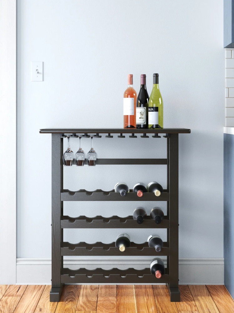 Stock up on a collection of your favorite bottles of wine with this wooden wine bottle and glass rack. Set it in your kitchen, dining room, or near a bar area, for easy access to serve guests. It features a 24-bottle capacity for all those reds, whites, and sparkling bottles you can’t live without, and enough space to store 18 pieces of stemware.