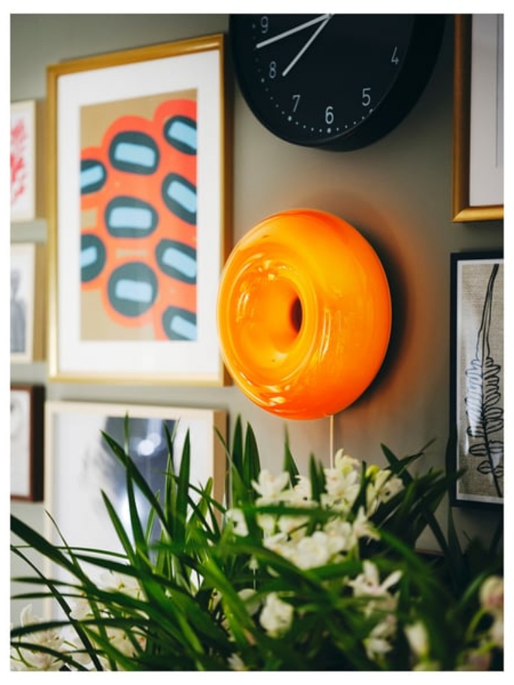• When the light passes through the lamp’s orange glass, the soft donut-like shape shines with a warm glow. A magical sight that’s an eye-catcher, regardless if it’s on a table or hanging on a wall.