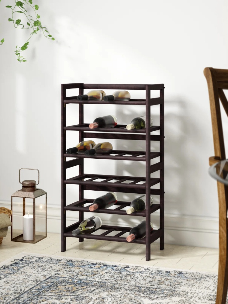 Crafted from elements of solid and composite wood, this sleek wine rack showcases six tiers with room to display up to 30 bottles of your favorite vintages. Its open design adds breezy flair to any space while its antique walnut finish pairs perfectly with natural accents and monochromatic color palettes. Add this piece to the living room to complement a traditional arrangement, or use it to level out a factory-inspired look in the den. For a dynamic display, match this design with a Persian-inspired rug and a diamond-tufted sofa for a contrasting style. With its clean lines and solid color pattern, this handsome design is a must-have addition to your furniture collection.
